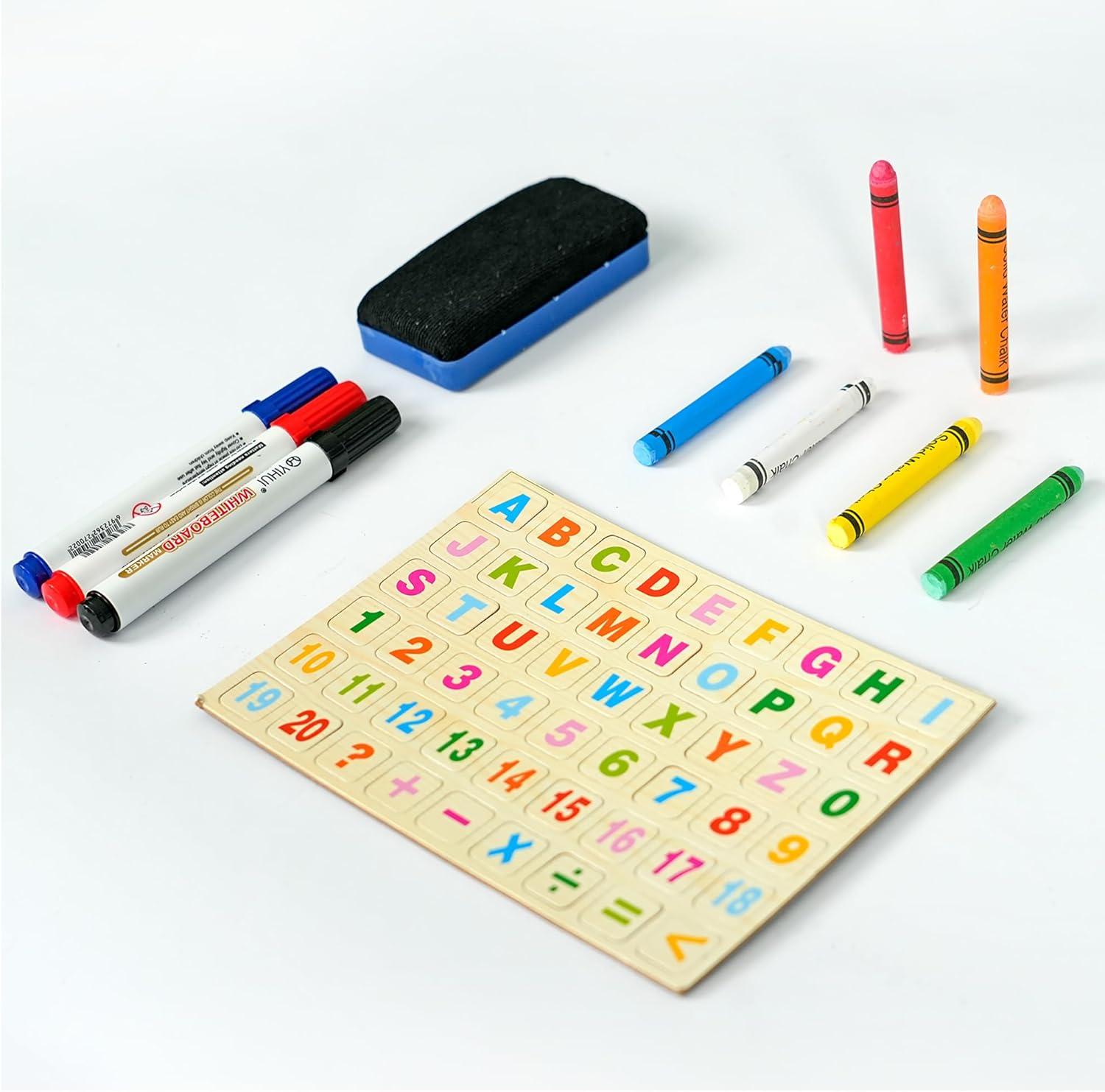 COMPLETE ART PACKAGE: Includes 26 alphabet letters, 20 numbers, 7 operators, 6 chalks, 3 markers and eraser. Everything needed for educational art sessions. All accessories are reusable and easy to clean for long-lasting fun.